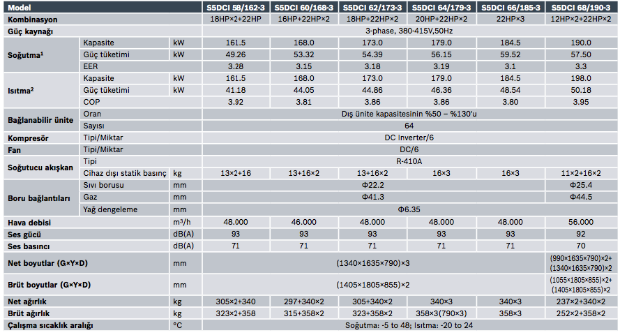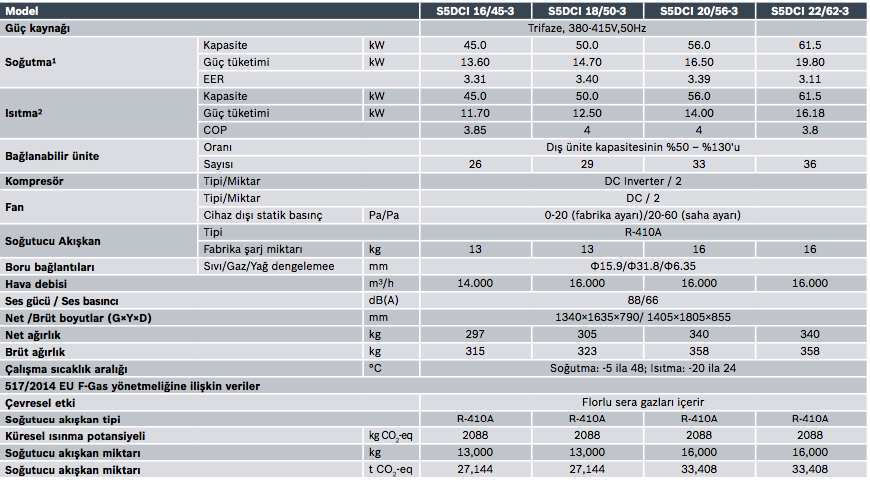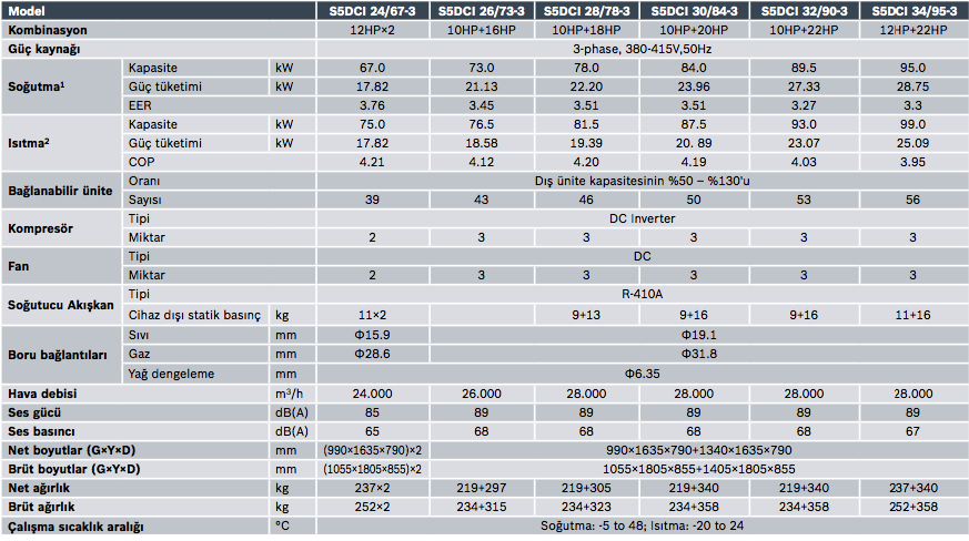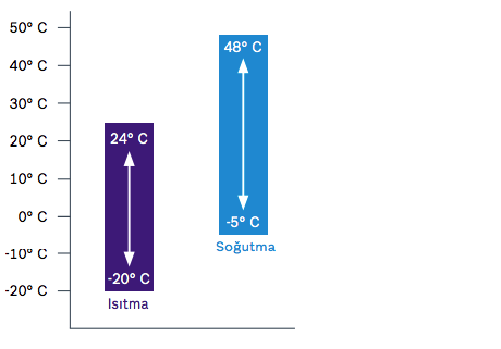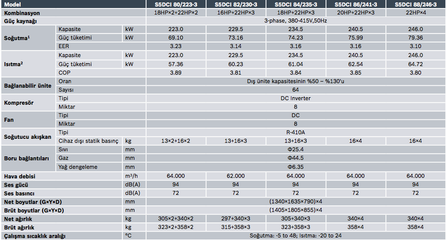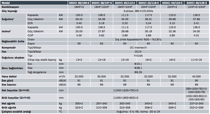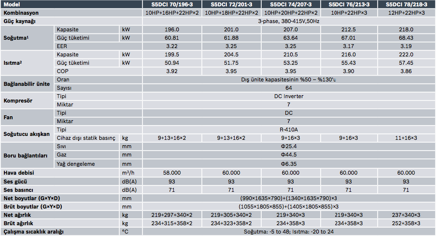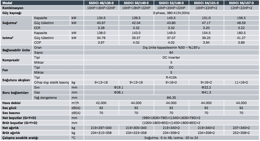 S5DCI dış üniteler soğutma modunda + 48 °C’ye kadar ve ısıtma modunda -20 °C’ye kadar çalışır. Soğutma modunda -5 °C’ye kadar kış koşullarında bile soğutma yapabilir ve ayrıca IT odaları, server odaları, UPS odaları, elektrik odaları gibi soğutma alanlarında kullanılabilir.