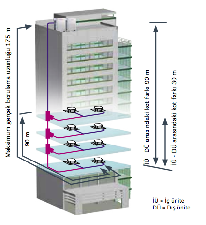 Yeni Eurovent sertifikalı Bosch VRF dış üniteleri 8 HP’den 88 HP’ye (25,2 kW’dan 246 kW’a kadar nominal soğutma kapasitesi) kadar geniş bir aralık sunmaktadır. S5DCI serisi, toplam 1.000 metre borulama uzunluğu olmak üzere maksimum 200 metreye kadar eşdeğer borulama uzunluğuna olanak verir, dış ünite ile iç üniteler arasında 110 metre, iç üniteler ile arasında 30 metre kot farkı, proje tasarım aşamasında esneklik sağlar. 13 farklı VRF iç ünite modeli, oteller, hastaneler, ofisler, villalar, yüksek binalar gibi farklı bina ve uygulama türleri için en uygun sistem çözümü imkanı sunar.
